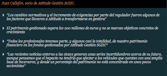 Pero siete años más tarde, en 2016, Attitude Asesores AV obtenía la autorización por parte de la CNMV para transformarse en sociedad gestora de IICs, forma con la que hoy cumple 10 años de vida. “Esta evolución lógica corresponde a los pasos naturales de crecimiento de un proyecto empresarial orientado a la gestión. Los cambios normativos y el incremento de exigencias por parte del regulador fueron algunos de los factores que llevaron a Attitude a transformarse en gestora”, explica Juan Callejón, socio de Attitude Gestón SGIIC.