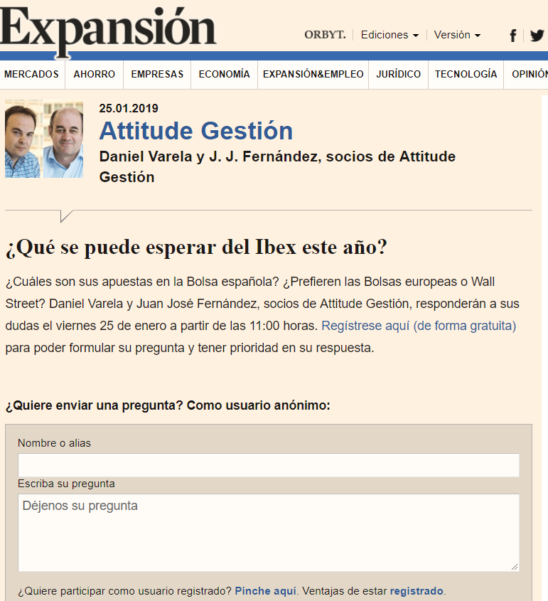 El pasado 25 de enero, Daniel Varela y JJ Fernández, socios y gestores del fondo Attitude Sherpa, realizarán el primer encuentro digital de 2019. En este encuentro contestaran a todas vuestras preguntas: ¿Cuáles son sus apuestas en la Bolsa española? ¿Prefieren bolsas europeas o americana? ¿Qué se puede esperar del IBEX este año?